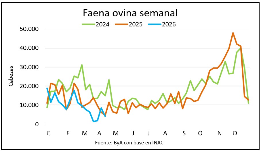 Volvió a caer la faena ovina que se redujo a menos de la mitad respecto a la semana anterior con solo 4.092 cabezas entre el 19 y el 25 de abril que llevó el parcial del mes a 17.130 lanares, 32% menos que en el mismo periodo de 2025.