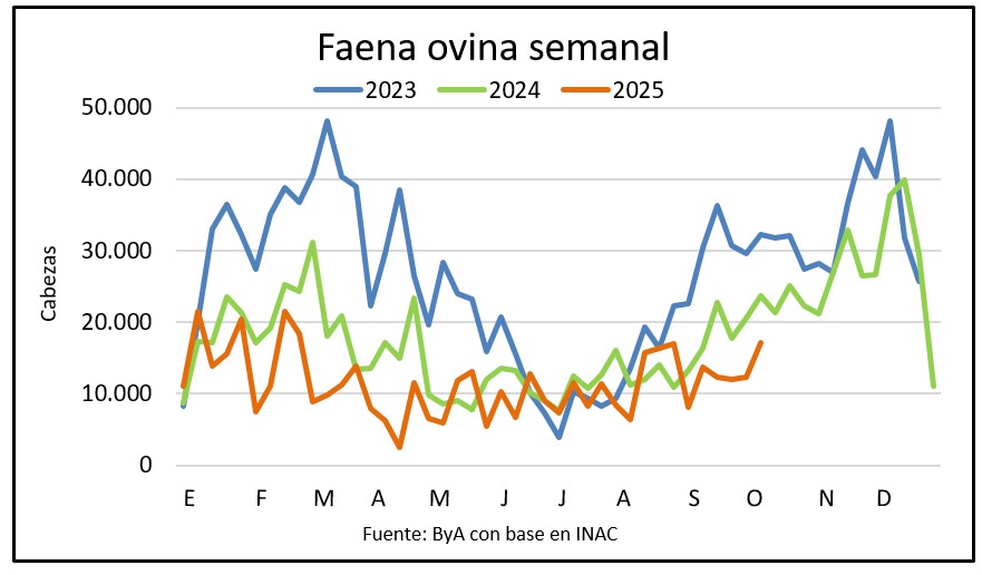 El acumulado anual muestra una reducción de 24% en la faena de lanares este año desde 628.594 a 479.718 cabezas hasta el 11 de octubre.