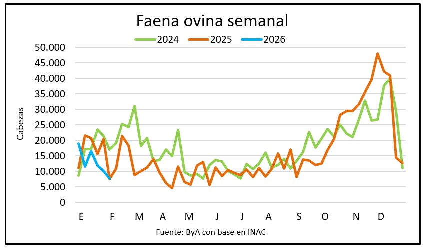 La faena ovina de la última semana volvió a caer por tercera semana seguida luego de un firme comienzo de año y fue la menor desde fines de mayo de 2025.