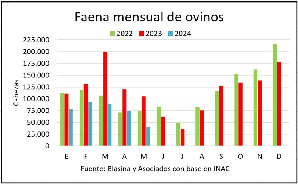 En lo que va de 2024 la faena de lanares bajó casi 44% y suma 375.197 cabezas frente a 665.870 en 2023 y a 484.616 en los primeros cinco meses de 2022.