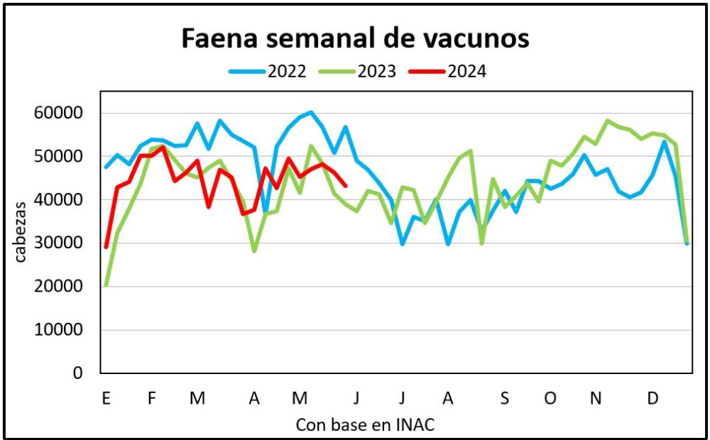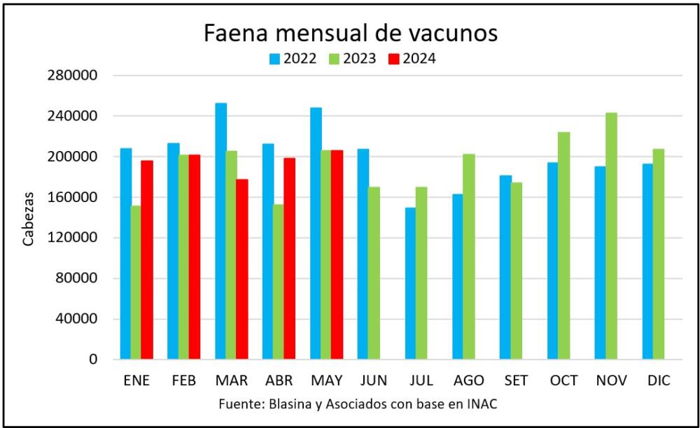La faena vacuna en el mes de mayo fue prácticamente igual a la del mismo mes de 2023 con 206.085 cabezas, solo 78 animales menos que el año anterior. Mayo es el mes que tuvo mayor actividad en 2024, por encima de febrero.