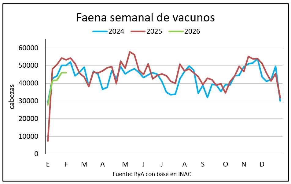 La faena vacuna de enero con 179.503 cabezas fue la más baja en tres años para el mes; unos 30 mil más respecto a los 150.889 vacunos de enero 2024 pero casi 28 mil menos que los 207.097 de enero de 2025.