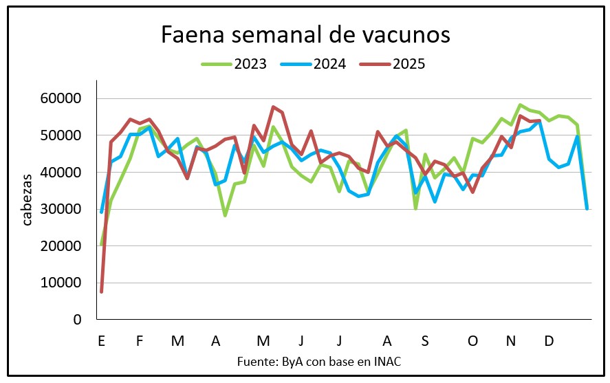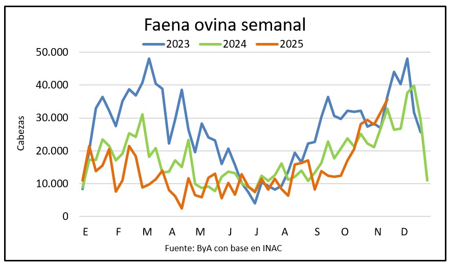 La faena vacuna sumó 53.903 cabezas entre el 16 y el 22 de noviembre, apenas 123 animales más que la semana anterior, al tiempo que la actividad en ovinos creció 12,5% hasta 35.669 cabezas, nuevo máximo en 2025.