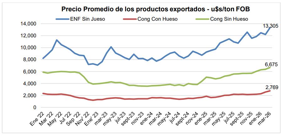 El precio promedio de exportación de carne vacuna en marzo fue récord, superando el pico de US$ 6.300 por tonelada alcanzado en abril de 2022. Promedió US$ 6.802 por tonelada, 7% por encima del valor obtenido en febrero y un 43% arriba del precio medio de marzo de 2025, que había sido de US$ 4.760 por tonelada.