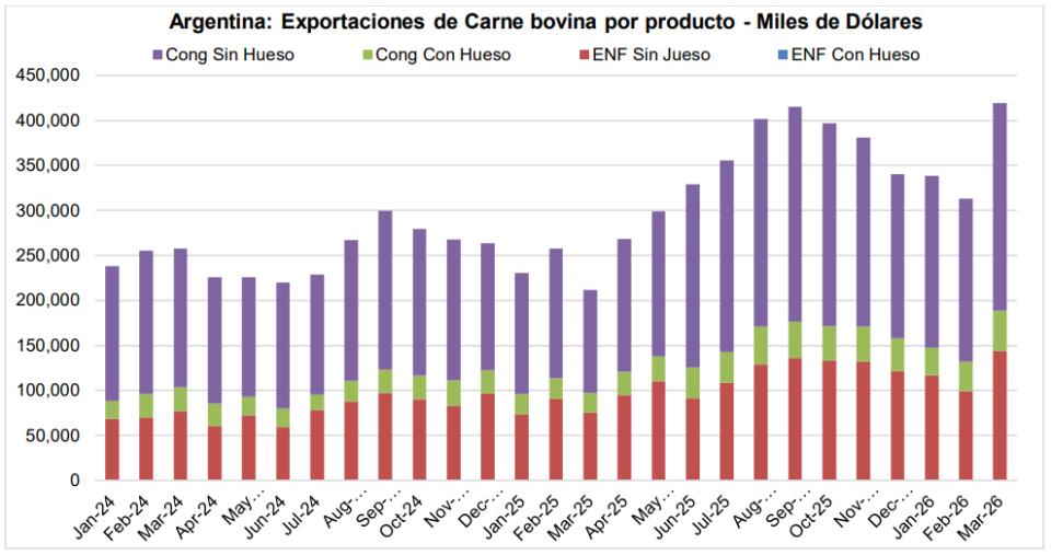 “El acumulado de los primeros tres meses del año 2026, revela que las ventas al exterior de carne bovina refrigerada y congelada resultaron cercanas a las 164,1 mil toneladas peso producto; por un valor de aproximadamente 1.070,8 millones de dólares. Con relación a los primeros tres meses de 2025, los volúmenes exportados son un (+14,3%) superiores; mientras que el valor obtenido ha sido un (+52,9%) superior”, señaló Mario Ravettino, presidente del Consorcio ABC.