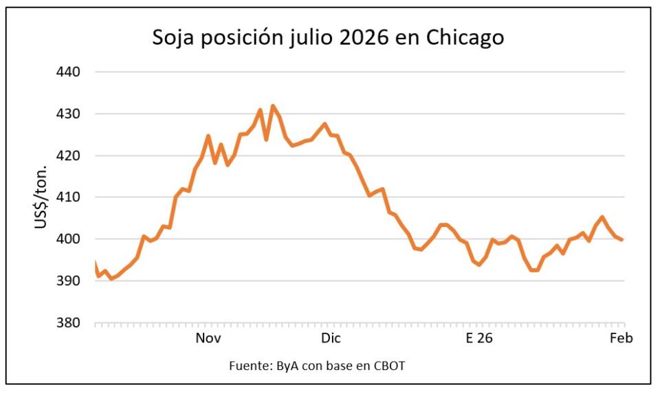 La soja volvió a perder la línea de los US$ 400 por tonelada en la posición julio 2026 de la Bolsa de Chicago en una jornada de ajuste para los granos que dejó las cotizaciones locales entre US$ 360 y US$ 365 /ton, por debajo de la semana anterior cuando se había acercado a los US$ 370 por tonelada.