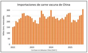 Las importaciones chinas de carne vacuna —tanto enfriada como congelada— marcaron en setiembre de 2025 un máximo histórico en volumen, con 316.000 toneladas peso producto, por un valor total de US$ 1.740 millones de dólares, según datos de la Administración General de Aduanas de China (GACC) difundidos por Informe Ganadero. … Sigue leyendo Histórico récord en las importaciones chinas de carne vacuna