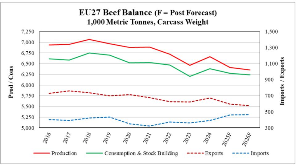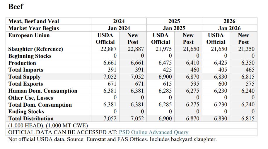 La oficina del USDA en la Haya proyecta que en 2026 las importaciones de carne vacuna de la Unión Europea seguirán creciendo, y se acelerarán en la segunda mitad del año, en vistas a la puesta en marcha del Reglamento de la UE sobre cadenas de suministro libres de deforestación, que comenzará a regir el 30 de diciembre de este año.