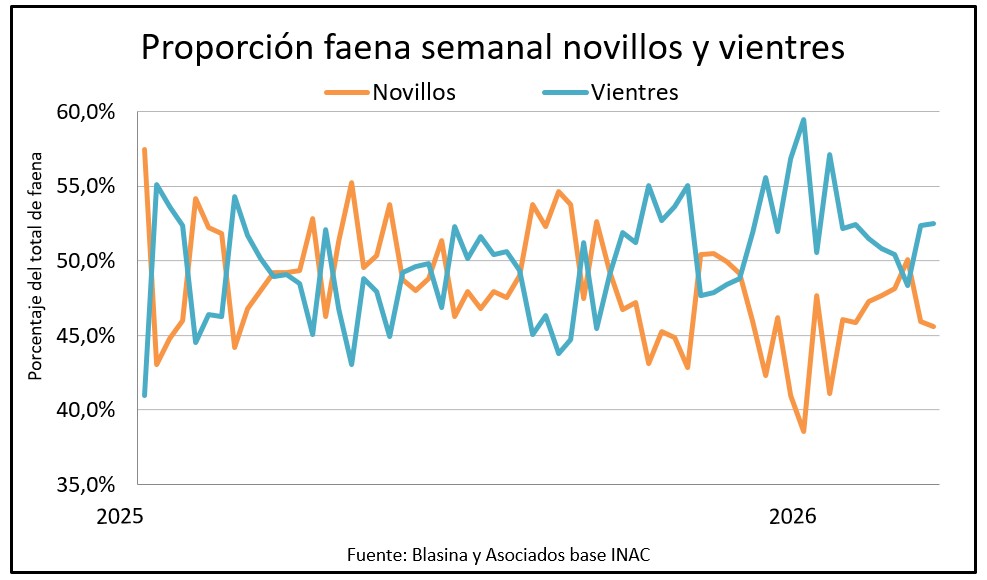 Los vientres volvieron a superar a los novillos en una proporción de 52,5% a 45,6% en la semana y en lo que va de 2026 los novillos han representado el 47% de la faena –un punto menos que en 2025- las vacas 37% y las vaquillonas 15%, ambas categorías un punto porcentual por encima del año anterior.