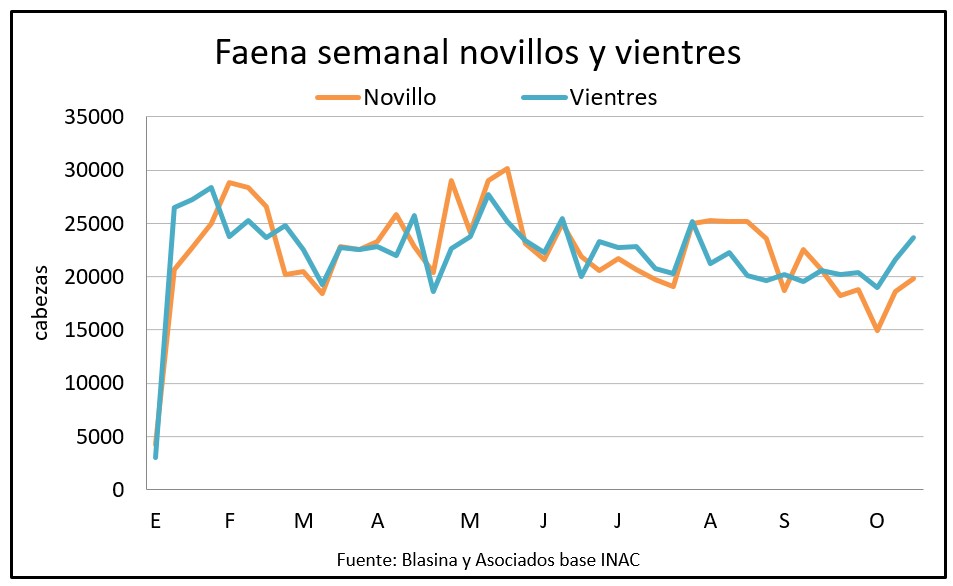 Hasta el 18 de octubre la faena ha sido 6,4% inferior al acumulado mensual del año pasado a la misma fecha con 105.526 cabezas frente a 112.710 y podría ser el segundo mes de baja interanual luego de agosto.