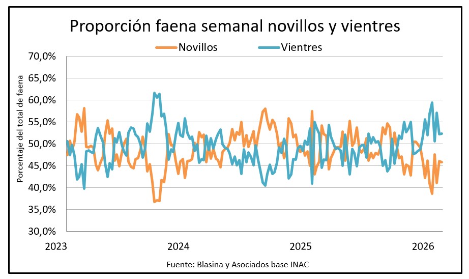 El incremento de la última semana se repartió en las vacas y los novillos, que bajaron su participación de 46,1% a 45,8% en la última semana y llevan nueve semanas siendo menos que los vientres.