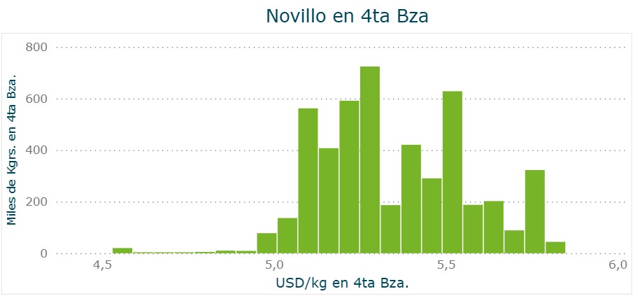 Los negocios por novillos se concretan entre US$ 5 y US$ 5,05 por kilo en cuarta balanza y ya no se consiguen con facilidad los precios de opnta de entre US$ 5,10 y US$ 5,15 que se obtenían la semana pasada.