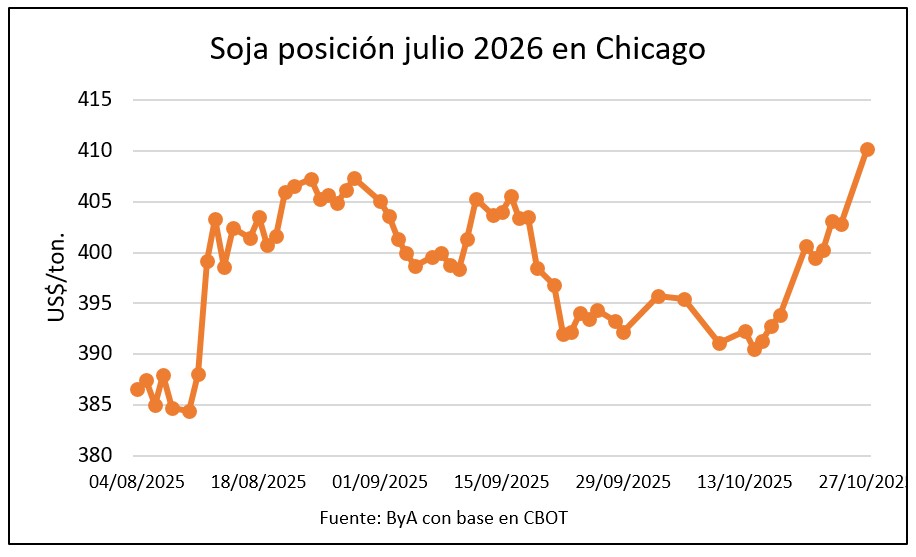 La cotización de la soja posición julio 2026 ganó más de US$ 9 este lunes hasta US$ 410,14 por tonelada, su cotización más alta en el actual ciclo comercial, y con referencias en Uruguay por encima de los US$ 370 /ton. En un día subió más que en toda la semana pasada.