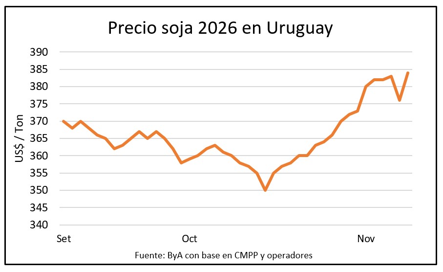 Las referencias para la soja en Uruguay alcanzaron este lunes los US$ 384 por tonelada para el grano de la cosecha de 2026 en las planillas de precios de operadores.