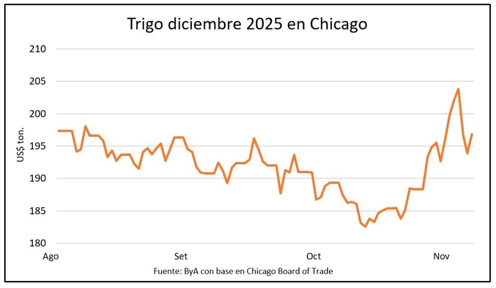 El trigo volvió a subir el lunes tras dos jornadas de ajustes y cerró a US$ 196,8 en la posición diciembre del mercado de Chicago. Se mantiene en los niveles más altos en más de tres meses. La referencia para diciembre 2026 se ubica en US$ 223 por tonelada y si se mantuviese recupera algo de atractivo para el trigo y cebada de la próxima cosecha.