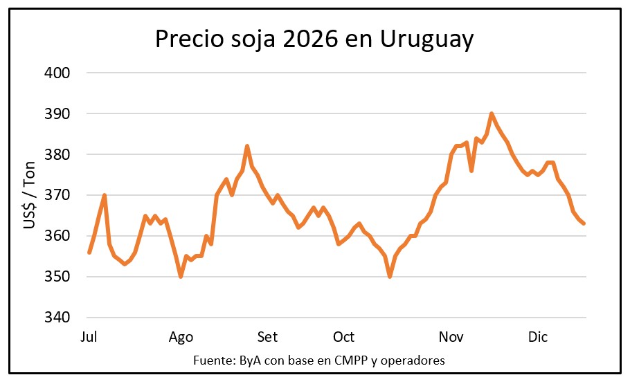 En Uruguay las referencias cayeron de US$ 378 a US$ 363 por tonelada para la soja de la próxima cosecha, con poca oferta.