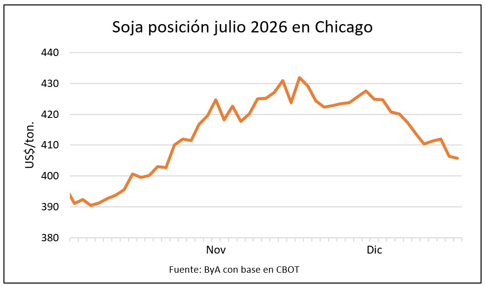La soja cerró a su menor valor en siete semanas en la posición julio 2026 de la Bolsa de Chicago con una cotización de US$ 405,7 por tonelada.