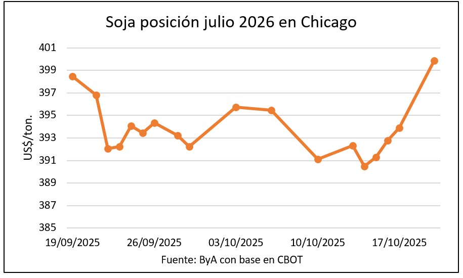 La cotización de la soja julio 2026 cerró a US$ 399,86 por tonelada este lunes en Chicago y alcanzó su mayor cotización en un mes tras siete jornadas de racha alcista y un repunte desde US$ 390 que había llevado las referencias locales hasta US$ 350 /ton.