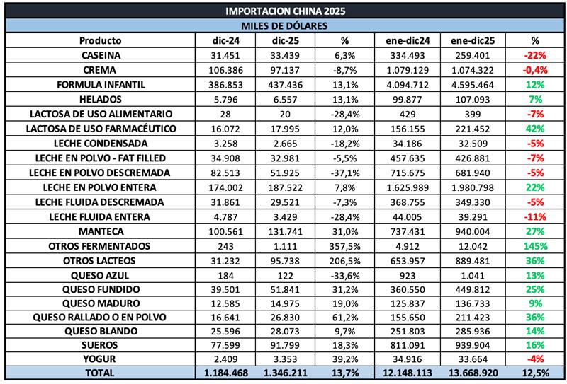 Las importaciones de lácteos de China cerraron el 2025 con saldo positivo. Crecieron 2% en volumen frente a 2024 y 13% interanual medido en dólares.