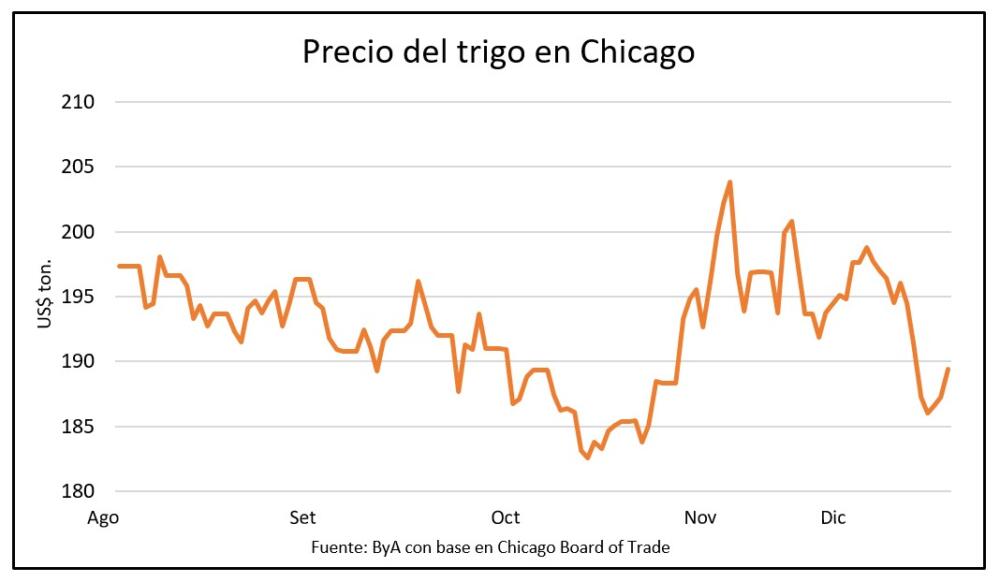 El trigo repuntó en las tres últimas jornadas en la Bolsa de Chicago luego de caer 8% en el último mes y el lunes cerró a US$ 189,4 por tonelada en la primera posición y a US$ 208,8 en la posición diciembre 2026, referencia de la próxima cosecha.