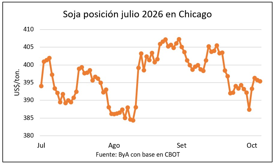 La posición julio 2026 bajó levemente de US$ 395,72 a US$ 395,45/ton con referencias en el mercado local que se mantienen estables en US$ 358 por tonelada