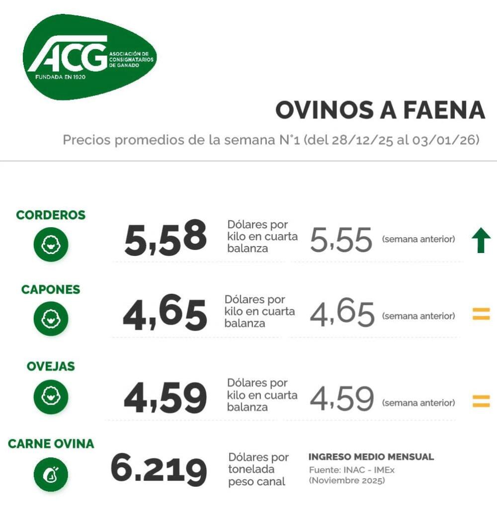 En lanares, el mercado sigue demandado aunque sin la fuerza previo a las fiestas, con poca oferta, y valores “más que interesantes”, en torno a US$ 5,60 el cordero. ACG señaló que «continúa la buena demanda, mercado equilibrado», con un promedio de US$ 5,58 para el cordero, tres centavos arriba de la semana anterior, US$ 4,65 para los capones y US$ 4,59 para las ovejas, sin cambios en los valores.