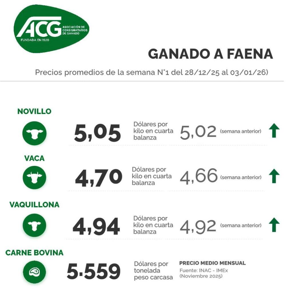 «Con actividad que se mantiene baja por los feriados, escasa oferta, mercado demandado», fue el comentario de la Asociación de Consignatarios de este lunes. El promedio de ACG subió tres centavos frente a la semana anterior, a US$ 5,05 por kilo para el novillos, cuatro centavos para la vaca que volvió a US$ 4,70 y dos centavos arriba para la vaquillona que promedió US$ 4,94 por kilo.