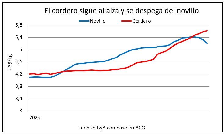 El promedio para los corderos en ACG cruzó el récord de 2011 y se situó en un máximo histórico de US$ 5,63 por kilo. Las ovejas agregaron tres centavos y cotizaron a US$ 4,73 y los capones a US$ 4,80 por kilo.