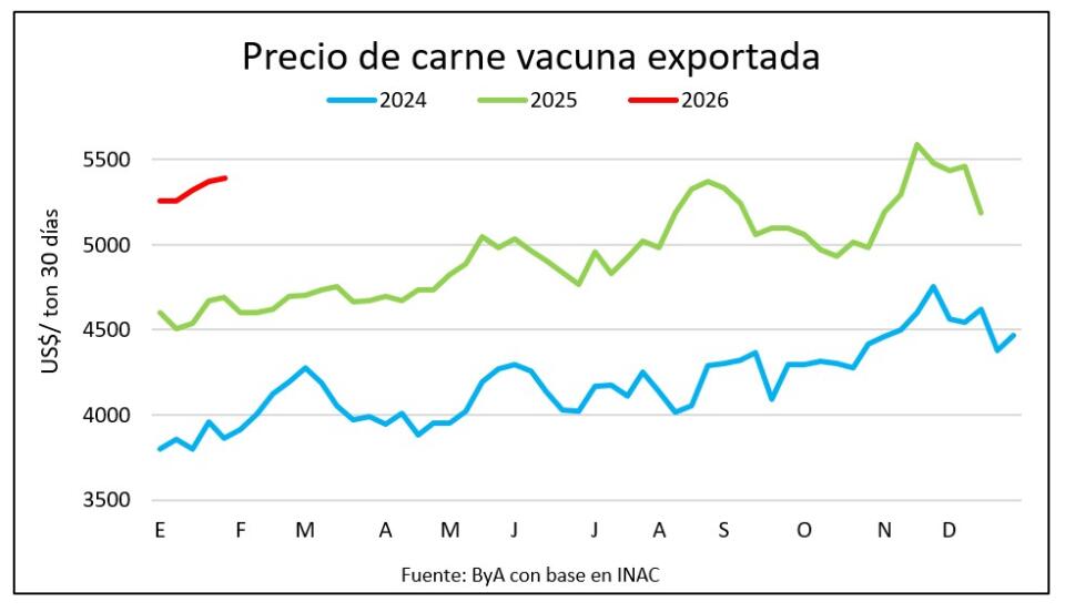 El precio de exportación de la carne vacuna fue de US$ 5.394 en enero, el mismo promedio que para los 30 días cerrados el 31 de enero de acuerdo a las estadísticas de INAC actualizadas este miércoles. Una suba de US$ 150 respecto a diciembre.