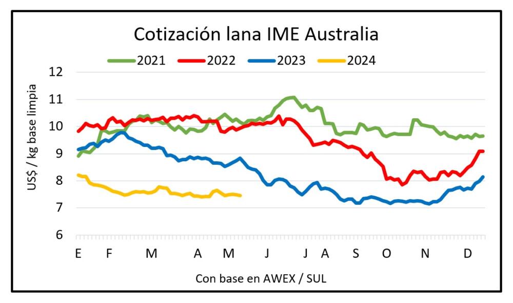 En algunas semanas con cotizaciones al alza -que han sido muy pocas- se puede pellizcar algún centavo más- pero el Indicador de Mercados del Este (IME) en Australia ha tenido altibajos dentro de un rango bastante estable de US$ 7,40 a US$ 7,70 por kilo base limpia. «La zafra está en la recita final y con porcentajes de venta muy altos que condicionan pelear los precios de este lado», apuntó el operador.
