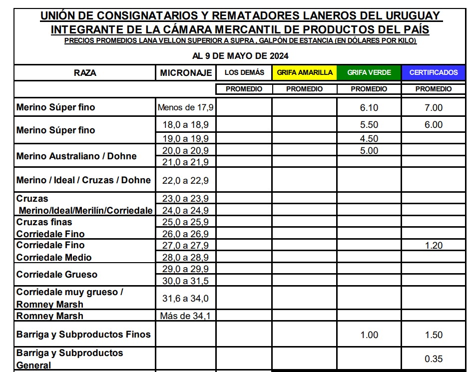 En otras referencias, la Unión de Consignatarios y Rematadores Laneros del Uruguay, marcó promedios de US$ 5,50 por kilo para lanas de 18 a 18,9 micras certificadas con grifa verde y US$ 6 por kilo con certificaciones; para lanas Merino de 20 a 21 micras US$ 5 por kilo vellón.