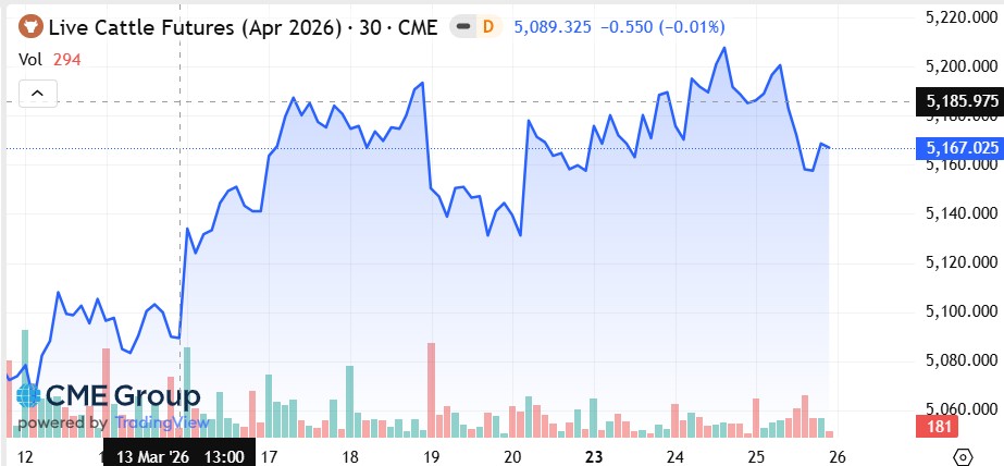 El USDA informó el lunes que el número de cabezas de ganado vacuno y terneros en engorde con destino a faena en EEUU, en corrales con capacidad para 1000 o más cabezas, ascendía a 11,55 millones el 1 de marzo, una cifra ligeramente inferior a la del 1 de marzo de 2025, que totalizaba 11,58 millones de cabezas, y algo superior a la estimación previa que proyectaba una baja mayor.
