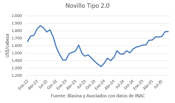 En setiembre el valor del Novillo Tipo 2.0 que elabora INAC fue de US$ 1.788 por cabeza, una suba marginal de 0,1% frente a agosto y 19% superior a igual mes de 2024.