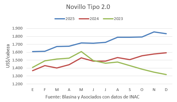 En diciembre, el Novillo Tipo mostró un leve descenso mensual de 1,2% a US$ 1.835, pero 15% superior a diciembre de 2024.