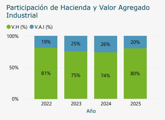 Por componente, en el promedio anual, la hacienda cerró en un valor máximo de US$ 1.392, un salto de 26% frente a 2024. Mientras que el Valor Agregado Industrial (VAI) cayó 13% interanual a US$ 338 por cabeza.