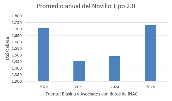 El índice Novillo Tipo 2.0 que elabora INAC marcó un récord en 2025, con un valor promedio de US$ 1730 por cabeza, una suba anual de 16%.