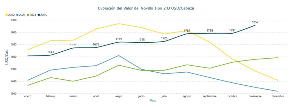 El valor de la hacienda dentro del indicador promedió US$ 1.324 por cabeza frente a US$ 1.075 de un año atrás (+23%).