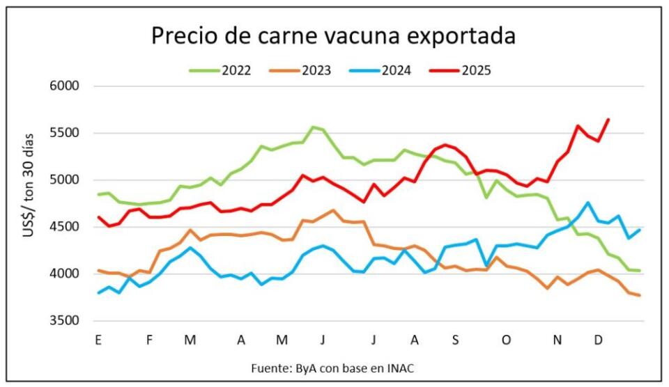 La tonelada de carne vacuna exportada en los últimos 30 días móviles sigue marcando máximos, con un promedio de US$ 5.647 por tonelada, valor superior al promedio deo de noviembre.