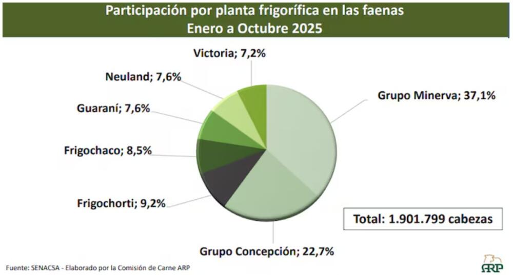 De acuerdo al Senacsa paraguayo, de los 1,9 millones de vacunos faenados entre enero y octubre de 2025 el 37% corresponde a Grupo Minerva, 23% al Grupo Concepción y otras cinco industrias –incluida Victoria- se reparten el 40% restante a razón de entre 7% y 9% de la faena cada una.