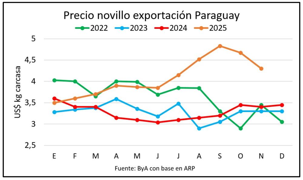 El precio del novillo gordo por su parte se sitúa en US$ 4,30 por kilo carcasa, estable en las últimas dos semanas, luego de alcanzar máximos históricos por encima de US$ 4,80 por kilo en setiembre en un marco de altos precios de la carne y menor oferta de animales terminados.