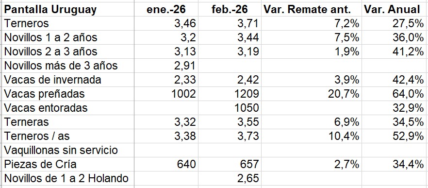 Los lotes mixtos de terneros no se quedaron atrás y promediaron US$ 3,73 por kilo –también récord- con una suba de 10,4% frente a enero y de 53% respecto a febrero de 2025.