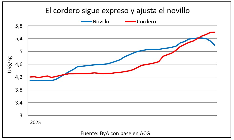 Los corderos subieron de US$ 5,53 a US$ 5,59 en la grilla de ACG la última semana, a dos centavos del récord histórico de 2011 establecido en US$ 5,61 por kilo.