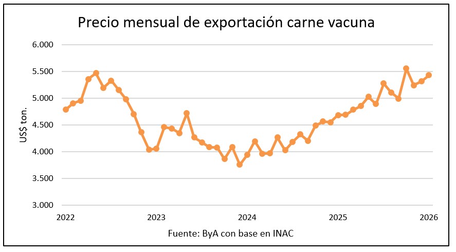 En lo que va del año el precio de exportación promedia US$ 5.374 por tonelada, 15% arriba de los US$ 4.692 registrados en el primer bimestre del año pasado.