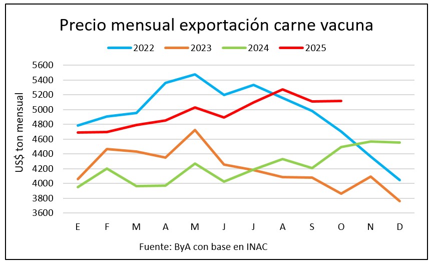 El precio de la carne vacuna fue récord para octubre, con una firmeza estructural. El Ingreso Medio de Exportación el mes pasado fue de US$ 5.116 por tonelada, y superó en 14% los US$ 4.492 promedio de octubre de 2024. También se ubicó por encima de los US$ 4.705 de octubre de 2022.