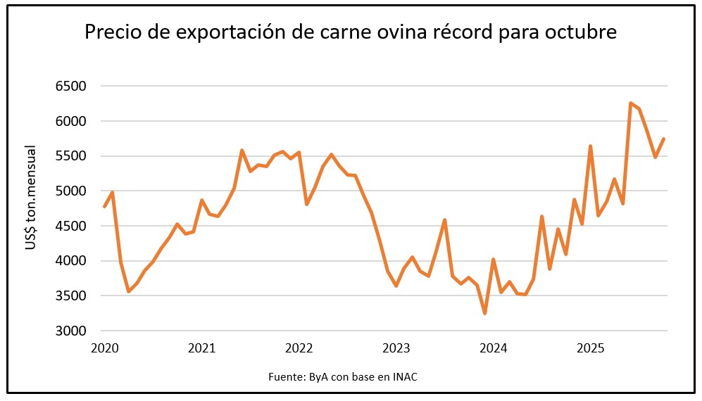 En carne ovina, el precio de exportación también se muestra firme. También fue el mejor octubre registrado, con un promedio de US$ 5.739 por tonelada, una escalada de 40% si se compara con los US$ 4.088 de octubre en 2024. Y superó el precio máximo alcanzado en octubre de 2021, con US$ 5.508. En octubre de 2022 se situó en US$ 4.683.