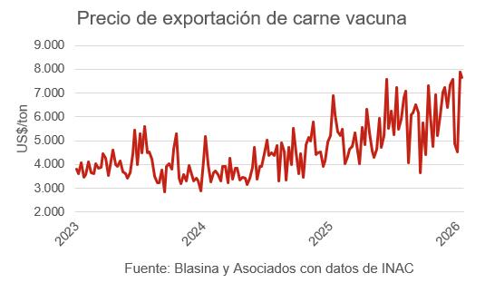 En el arranque del año se afirman los precios para la carne vacuna exportada. En los últimos 30 días la tonelada se situó en US$ 5.520 y en la última semana promedió US$ 5.862, de acuerdo a los datos preliminares de INAC, publicados este miércoles.