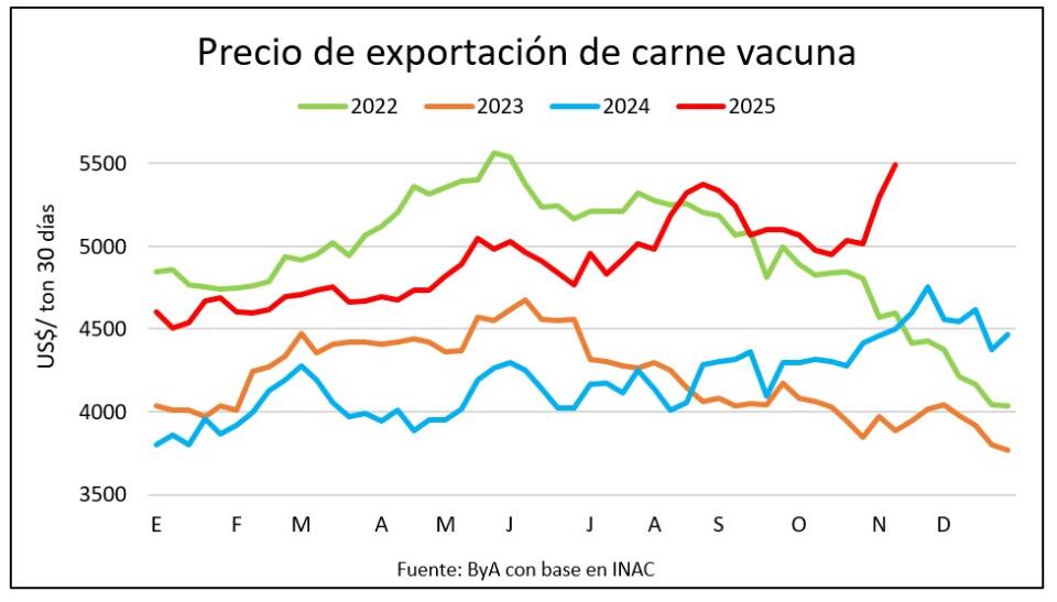 En los últimos 30 días el precio de exportación de la carne vacuna alcanzó los US$ 5.492 por tonelada, de acuerdo a los datos preliminares de INAC. Aún no alcanzó el récord logrado en 2022, pero sí un máximo para los últimos tres años.