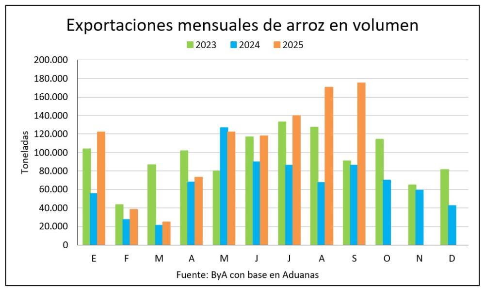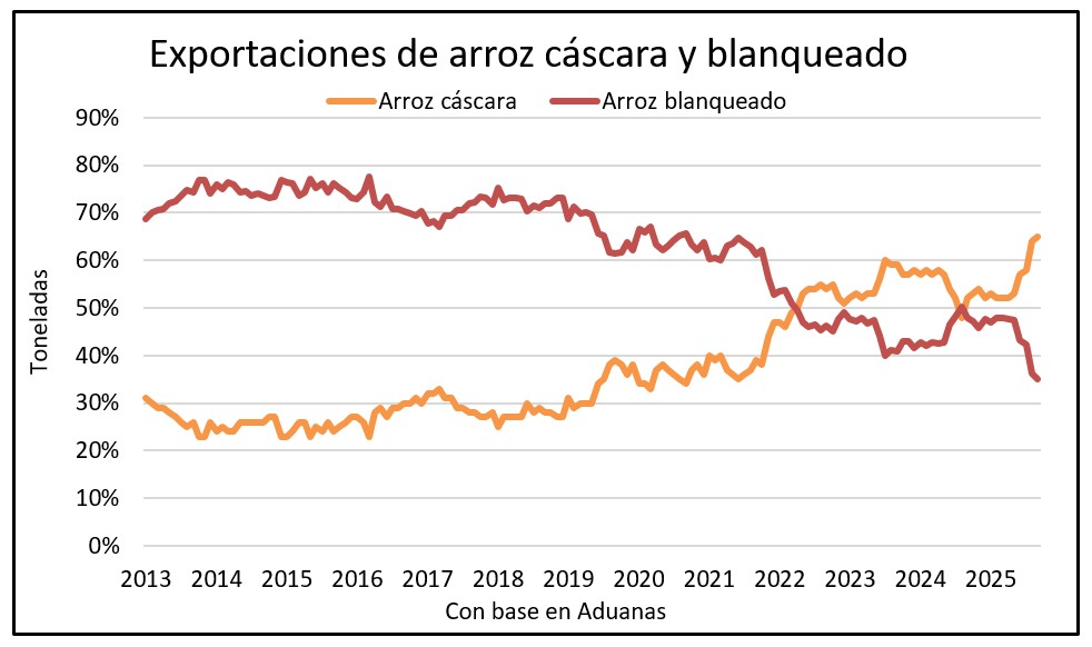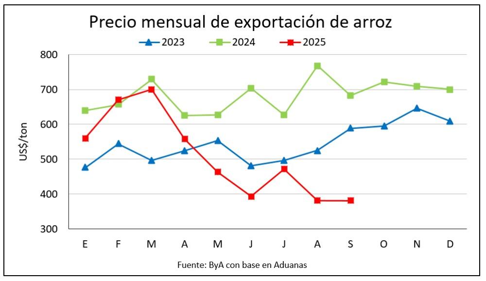 El promedio de precio de exportación para el arroz blanqueado en la cosecha pasada (marzo-setiembre) fue de US$ 774 por tonelada y este año bajó a US$ 581 por tonelada, con 250 mil toneladas exportadas en marzo-setiembre de 2024 frente a 234 mil en el mismo lapso de 2025.