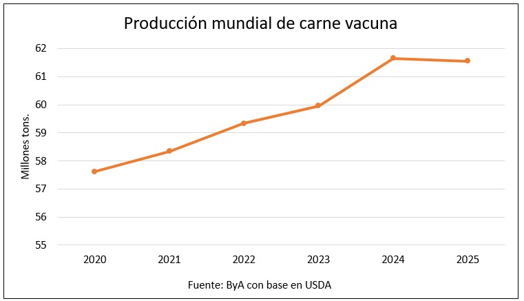 La producción mundial de carne vacuno aumentó 5,5% entre 2019 y 2024 y este año la tendencia cambió, con un descenso especialmente en Estados Unidos y Europa.