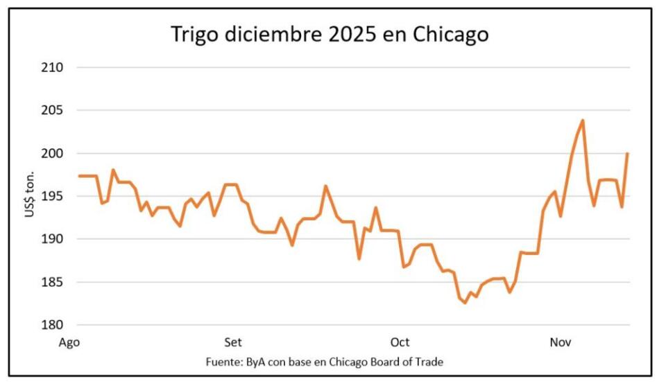 El precio del trigo subió 3,2% en la Bolsa de Chicago este lunes y la posición diciembre 2025, referencia para la cosecha de cebada en Uruguay, volvió a acercarse a los US$ 200 por tonelada: cerró a US$ 199,96, cerca de los máximos para los últimos seis meses que se registraron dos semanas atrás y permitieron una ventana de valores para fijar cebada a US$ 200 y US$ 202 por tonelada en el mercado local.